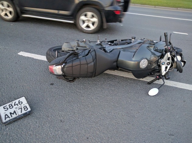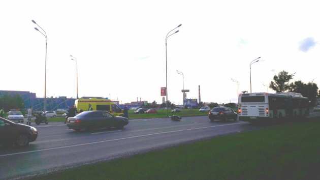 на развороте в сторону аэропорта на газоне ниссан. (Вероятно уходил от столкновения ). На средней полосе байк. Дпс и скорая на месте.