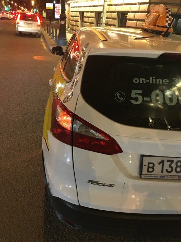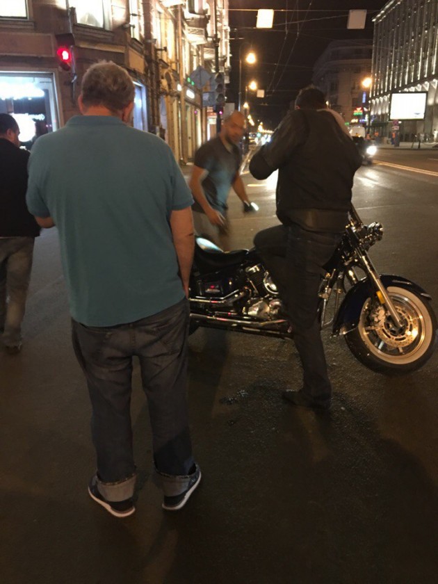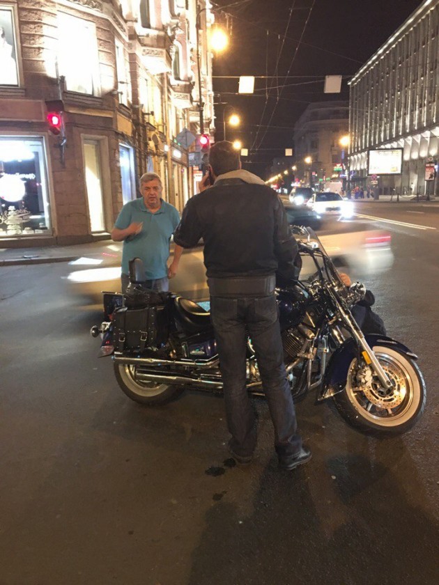 На большом проспекте Такси и мотоциклист. Движению не мешают, все живы, в 0:10.