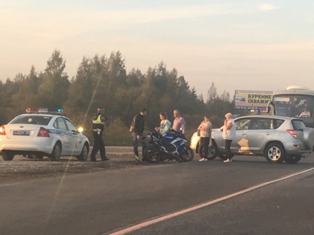 Мотоцикл въехал в бочину. Все живы. Объезд по встречке. ДПС на месте.