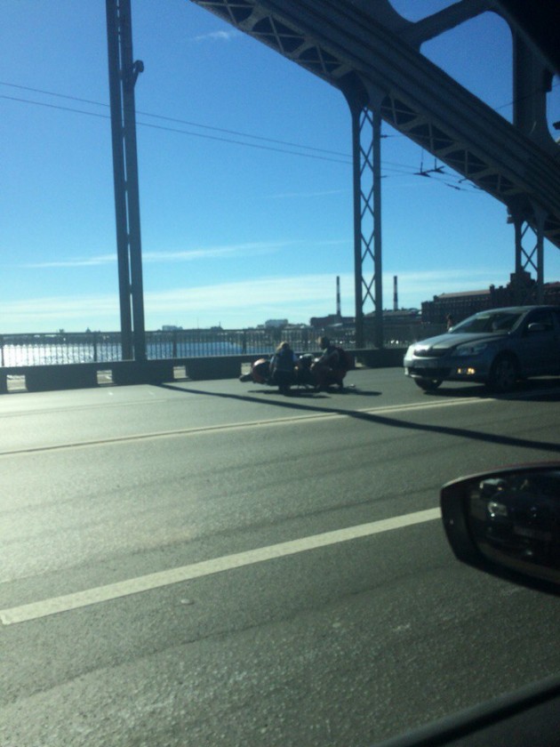 На Большеохтинском мосту, лежит мот. Мотоциклист рядом осматривает повреждения. Рядом сидит девочка, машины не видно.