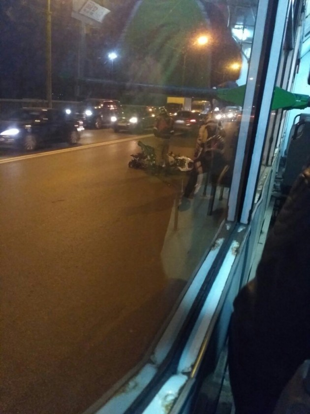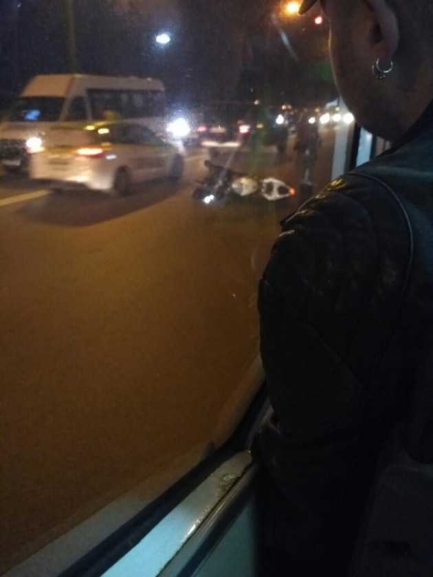 22:10 в сторону пр.Славы мотоцикл и автобус 56 маршрута. Перед мото в хлам, но живы все. За автобусом стоит еще около 10-12 мото.