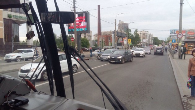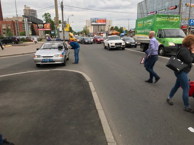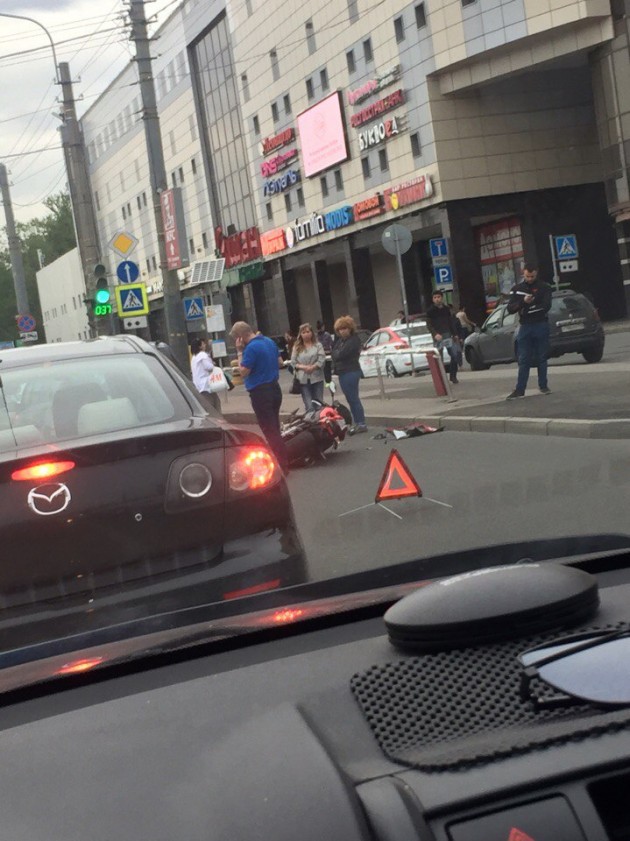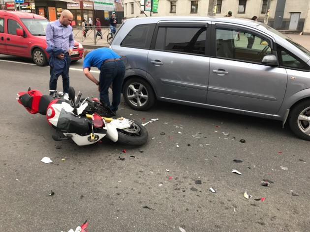 Опель, Ауди и мотоцикл столкнулись у метро Старая Деревня.