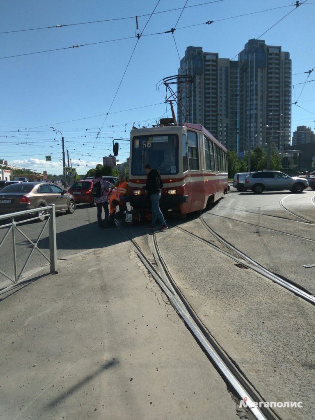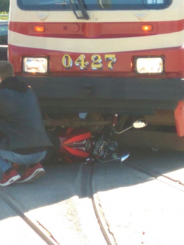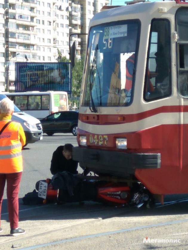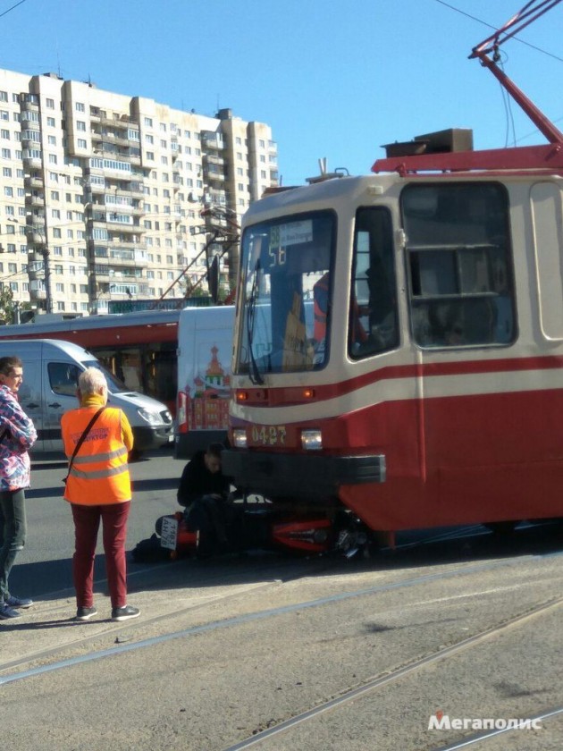 Перекресток проспекта Культуры и Просвещения, мотоцикл под трамваем.