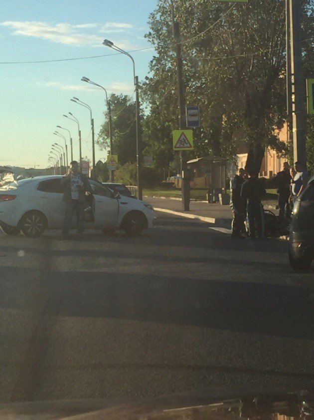 Киа завалил мотоцикл на Октябрьской набережной. Объезд по тротуару. Все живы. В сторону севера.