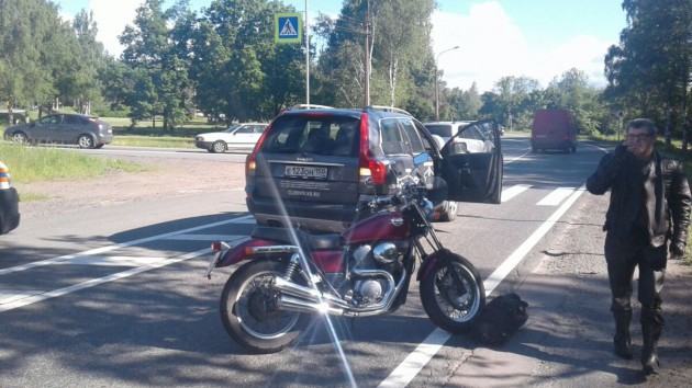 Приморское ш., Санкт-Петербург. Контактный телефон +7 (921) 913-5335. Пилот Honda VRX400 Федюхин Д.А. 1966 г.р. в хорошем настроении, на хорошей резине при солнечной сухой пустой Приморке не успел среагировать на мое торможение на пешеходном переходе. Напротив Лукойла, развязка с Приморским (нижним) шоссе. Поцарапал колено. МОт на ходу, погнуты перья вилки, минус ветровик и переднее крыло.