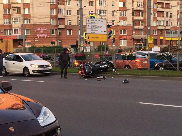 Только что Harley davidson electra glide с кем непонятно. Угол Наставников и Косыгина. Мотоциклист жив.