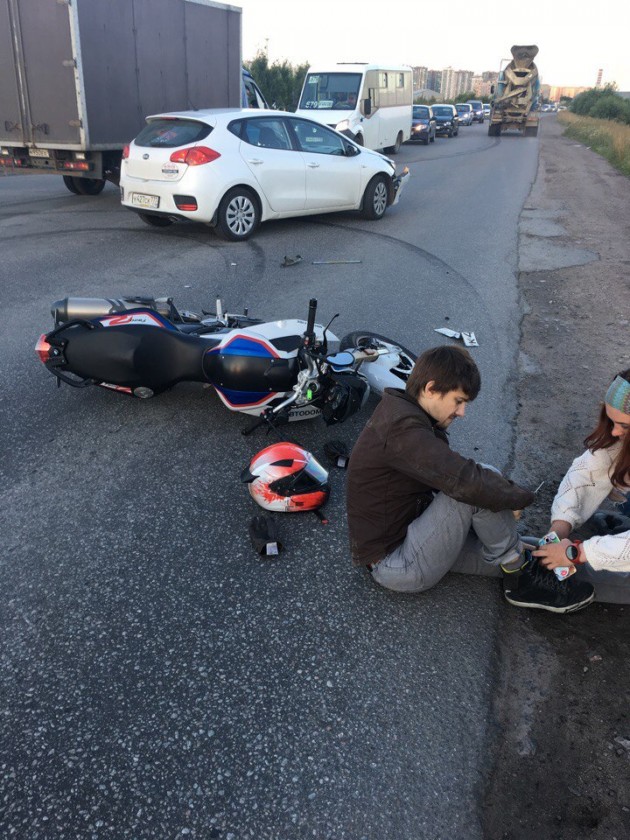 Девушка на KIA Cee'd сбила мотоциклиста на выезде из Ленты в Буграх. Скорую и ДПС вызвали.