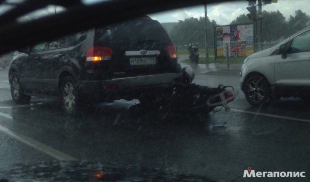 Пулковское шоссе из города, чуть дальше пересечения с Дунайским проспектом. Мотоциклист в скорой, службы на месте.