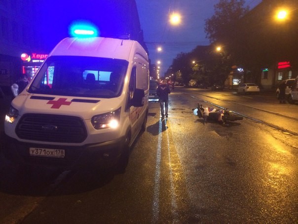 ул. Смолячкова 21, Санкт-Петербург. ДТП с участием мотоциклиста и легкового автомобиля напротив метро Выборгская (Смолячкова, 21). Две скорых на месте.