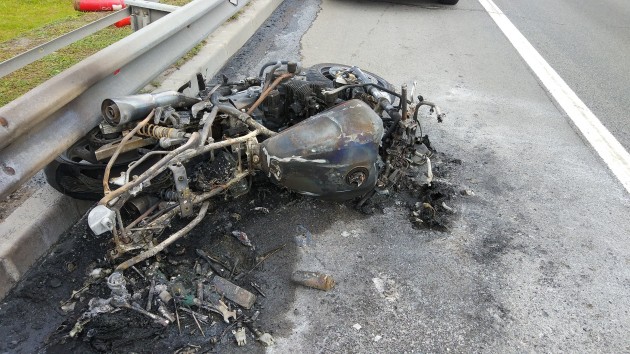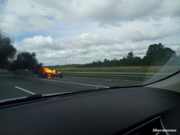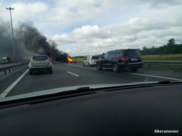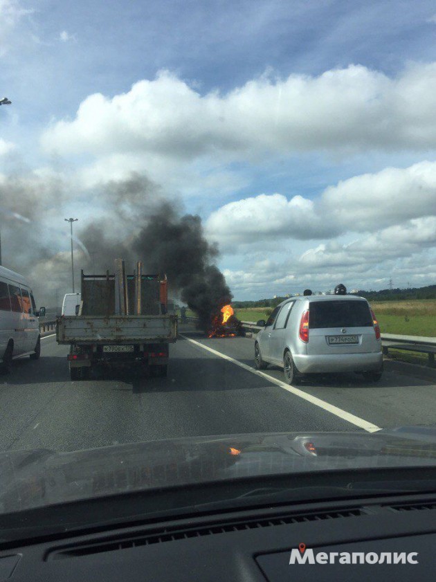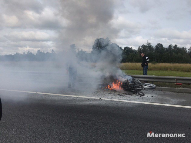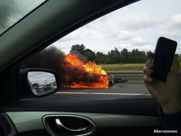 Дтп на КАД (внешнее) от пр. Энгельса до Выборгского ш., авто и мото. Женщина на Вольво перестраивалась и не заметила мото. Авто пробило колесо, а мотоцикл после падения и скользячки загорелся и полностью выгорел. Мотоциклист живой. Разыскиваются очевидцы ДТП и записи видеорегистраторов.