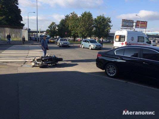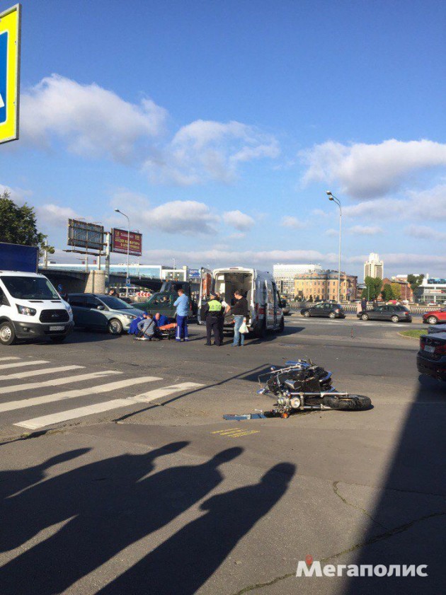 На пересечении Аптекарского проспекта и Аптекарской набережной мотоциклист на полном ходу вылетел с второстепенной и словил машину, которая ехала по главной. Все живы, у мотоциклиста вывернута нога в другую сторону.