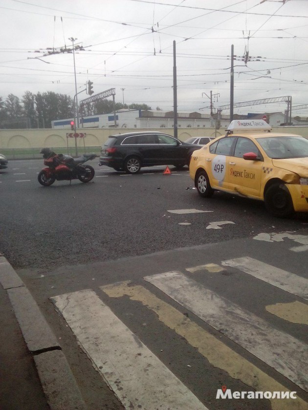 Дтп с мото на углу Лесного пр. и ул. Смолячкова, Яндекс такси и мотоцикл.