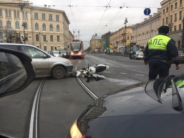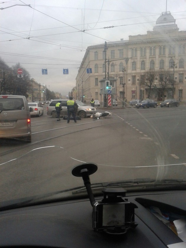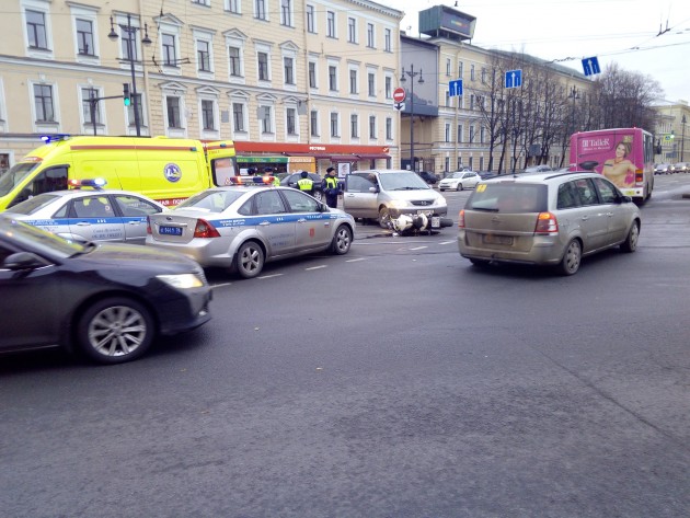 Мотоцикл попал под встречную Мазду, поворачивающую налево с Московского на Загородный около метро Технологический институт, реанимация и ДПС на месте.