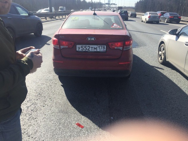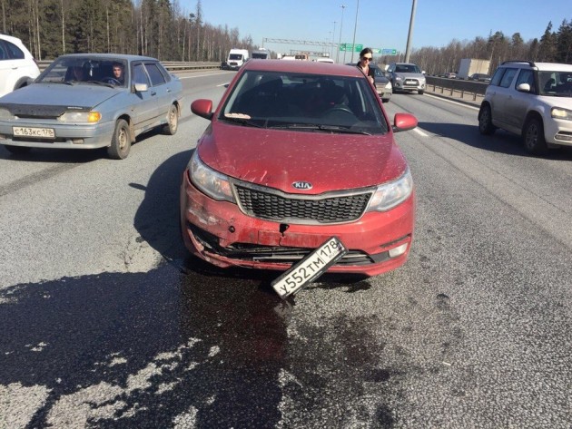 14 апреля около 10:35-10:40 Я двигалась по КАД на Киа Рио в третьей полосе со скоростью примерно 100-110 км/ч. Слева появился мотоциклист и резко стал маневрировать из крайней левой полосы в третью, стал так же резко тормозить. Мой тормозной путь оказался длиннее и колесо его мотоцикла затянуло под бампер, мотоциклист спрыгнул, а машину вздыбило на задние колеса. Далее мотоцикл вылетел из под машины.