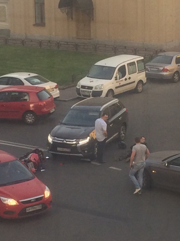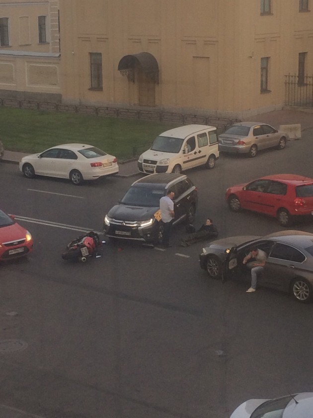 ДТП с мото у ВМА рядом с гостиницей Санкт-Петербург. Мотоциклист жив, скорая приехала быстро.