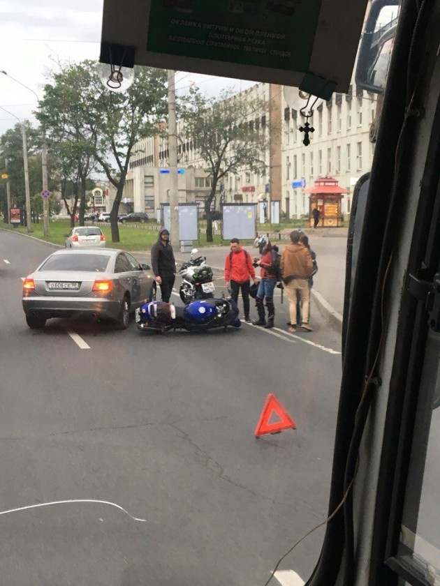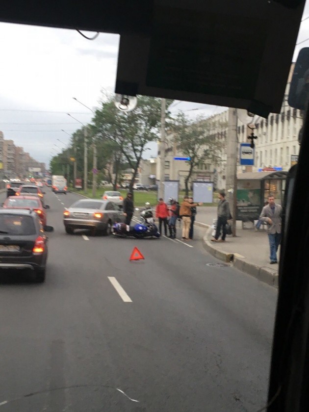 Дтп с мото на Ленинском проспекте д.144 к.1. У остановки общественного транспорта (у платформы). Все живы.