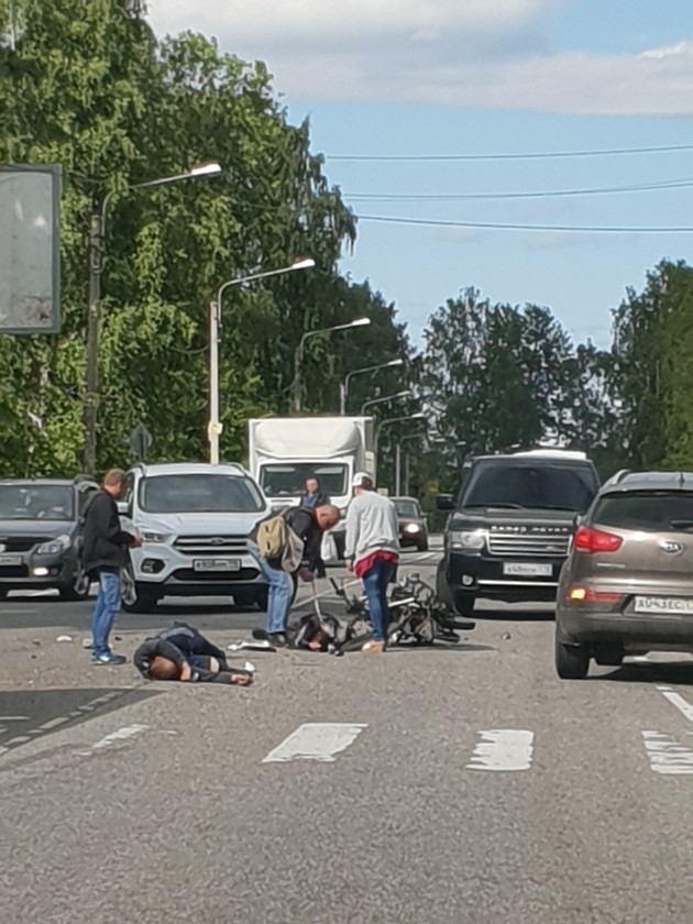 Дтп с мото не доезжая Лупполово по направлению из города. Неизвестно, что произошло, но похоже мотоциклист со всего размаху врезался в автобус.