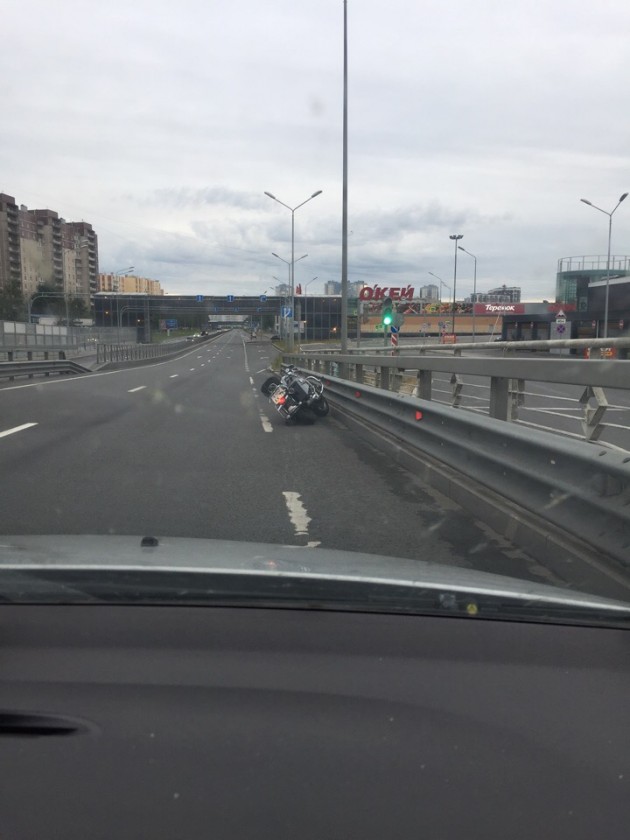 Приморское ш. Санкт-Петербург, Россия. На Приморском шоссе, видимо разбился мотоциклист, стоят попутки тормозят что бы ни кто добавочно не въехал, ждут скорую, что с водителем не понятно, мотоцикл в 50метрах