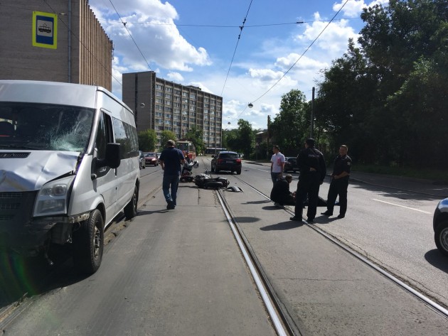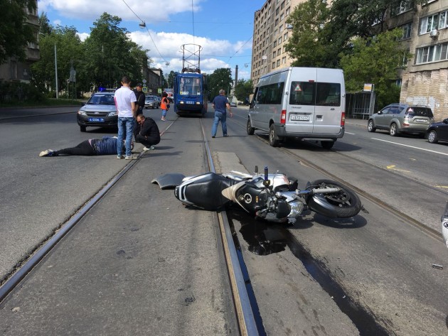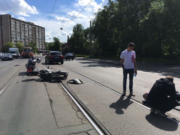 Дтп с мото примерно в 10:20 на ул.Трефолева 40/26. Мотоцикл стоял на рельсах, поворачивал налево, форд кого-то обгонял по рельсам и въехал ему в зад. Мотоциклист Владимир, отказался от госпитализации. Мотоцикл Suzuki без номеров. Маятник у мота оторвался полностью.