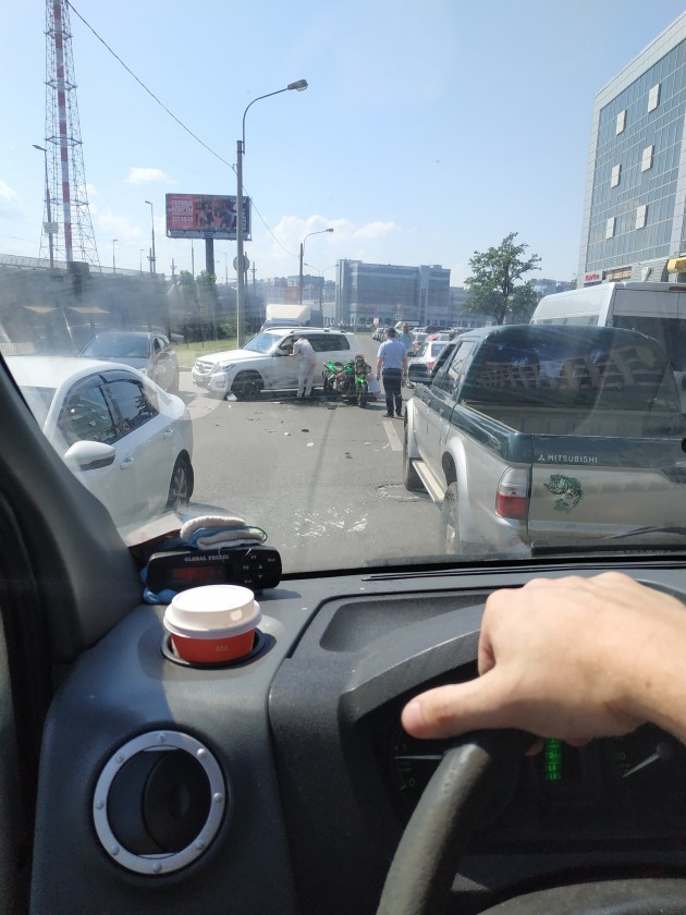 Дтп с мото на Кантемировской ул.. Мотоциклист живой, но сидит не встаёт. Мерседес выезжал с прилегающей территории и не пропустил мотоциклиста.