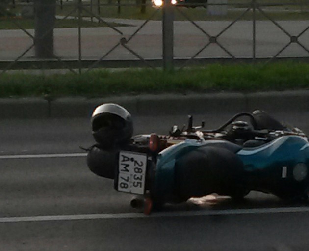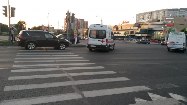 Дтп с мото на перекрестке пр. Славы и Пражской ул.. Мотоциклист (перелом ноги) в машине скорой помощи. Мот Honda 2835АМ78. На место ДТП приехала жена.