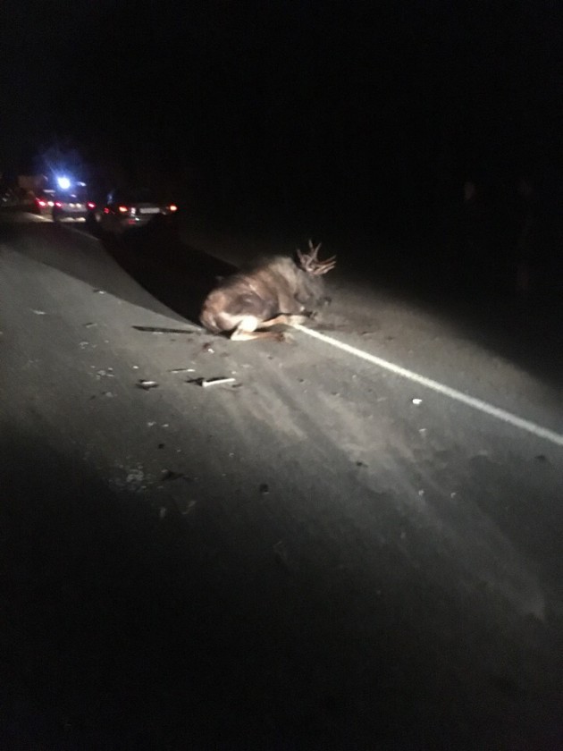 Мотоциклисту, который ехал сразу за автомобилем, пришлось упасть, чтобы не столкнуться с лосем