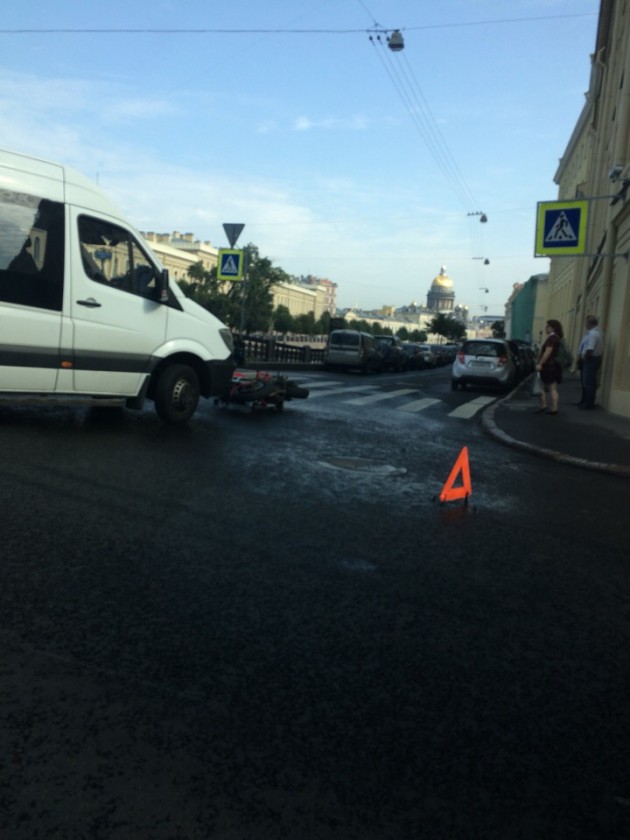 Дтп с мото примерно в 11:30 на перекрестке наб. реки Мойка и ул. Глинки (у Поцелуева моста). Микроавтобус поворачивал налево и не пропустил мотоцикл. Мотоциклист цел.