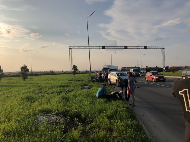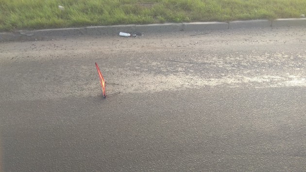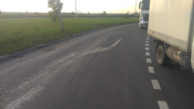 Круг был в масле. Мотоциклисты чуть не упали. Колеса в масле все. Прижались и остановились, чтоб не убиться и не влететь под машины и фуры. Только слезли колеса осмотреть, и успокоиться после расколбаса, и их снесли.