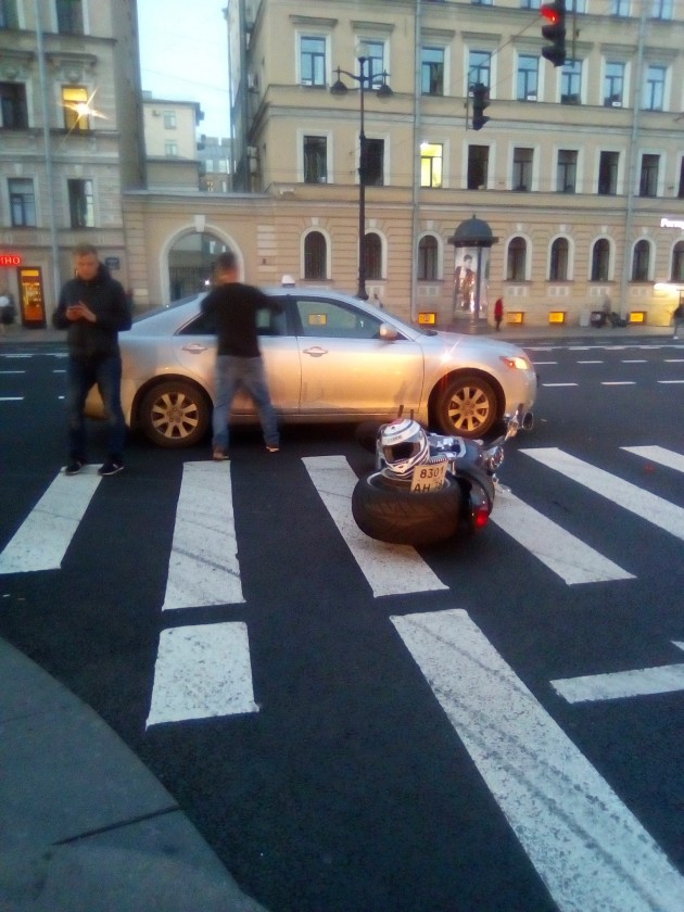 Дтп с мото на углу Невского пр. и ул. Профессора Ивашенцова. Все живы, небольшой шок и поцарапано колено.