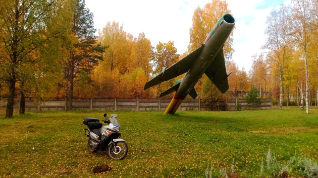 Самолет МиГ-19 на пьедестале в авиагородке аэродрома Лодейное Поле.